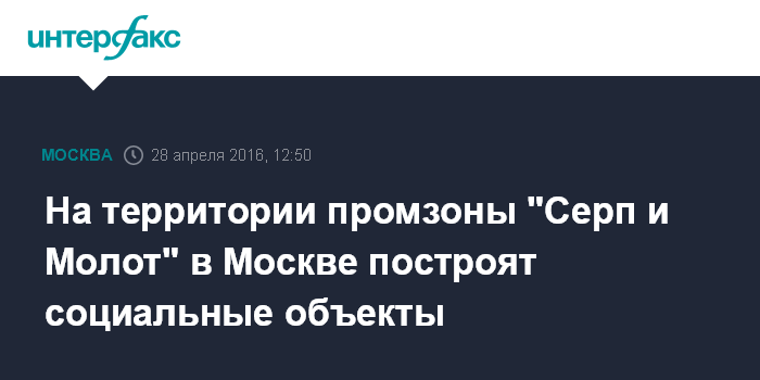 Москва. 28 апреля. INTERFAX.RU - На реорганизуемой территории бывшего завода "Серп и Молот" планируется построить объекты социального назначения. Об этом сообщает пресс-служба департамента градостроительной политики столицы.