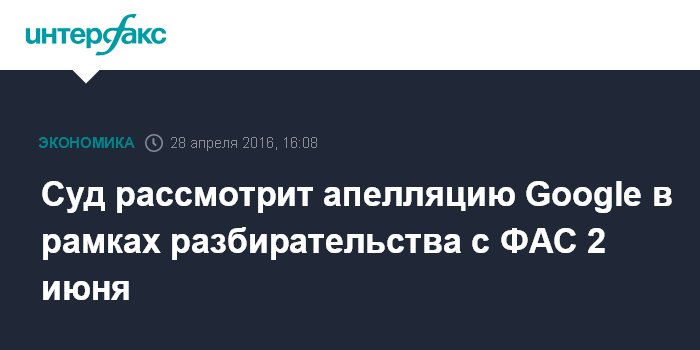 Москва. 28 апреля. INTERFAX.RU - Девятый арбитражный апелляционный суд 2 июня рассмотрит апелляционную жалобу Google, поданную в рамках разбирательства с Федеральной антимонопольной службой (ФАС), следует из картотеки суда.