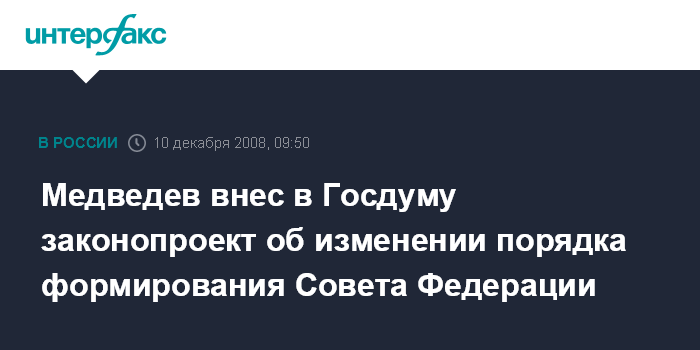 Москва. 10 декабря. INTERFAX.RU - Президент России Дмитрий Медведев внес в Госдуму проект федерального закона "О внесении изменений в некоторые законодательные акты РФ в связи с изменением порядка формирования Совета Федерации Федерального Собрания РФ", сообщает пресс-служба Кремля в среду.