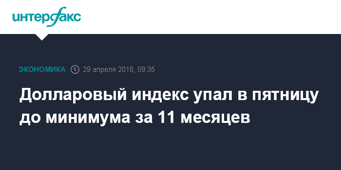 Москва. 29 апреля. INTERFAX.RU - Спотовый индекс, отслеживающий колебания доллара США относительно десяти основных мировых валют, упал в пятницу до минимального уровня за 11 месяцев, сообщило агентство Bloomberg.