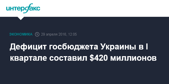 Москва. 29 апреля. INTERFAX.RU - Дефицит государственного бюджета Украины в первом квартале 2016 года составил 10,57 млрд гривен (около $420 млн по текущему курсу), тогда как по итогам января-марта 2015 года был зафиксирован профицит в сумме 4,17 млрд грн., говорится в сообщении министерства финансов.