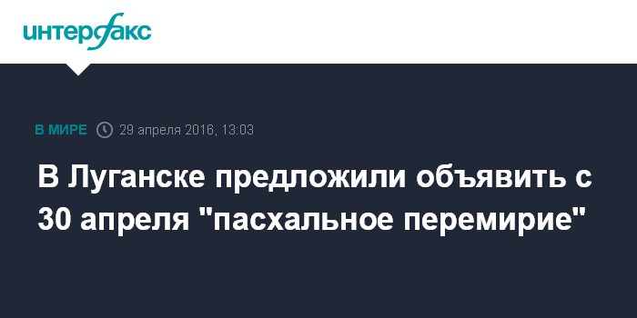 Москва. 29 апреля. INTERFAX.RU - Ополченцы самопровозглашенной Луганской народной республики гарантировали "режим тишины" на Пасху и майские праздники.