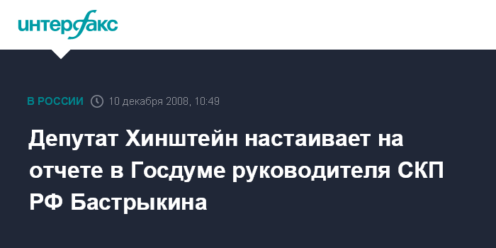 Москва. 10 декабря. INTERFAX.RU - Член фракции "Единая Россия" в Госдуме Александр Хинштейн заявил о необходимости пригласить руководителя Следственного комитета при прокуратуре РФ Александра Бастрыкина, чтобы он ответил на вопросы депутатов в рамках "правительственного часа".