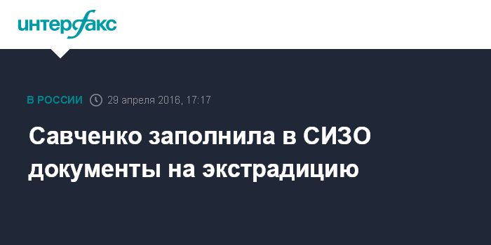 Москва. 29 апреля. INTERFAX.RU - Украинка Надежда Савченко, осужденная на 22 года за убийство российских журналистов, заполнила вместе со своим защитником документы на экстрадицию, сообщил "Интерфаксу" ее адвокат Марк Фейгин.