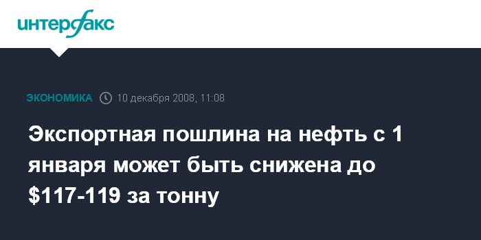Москва. 10 декабря. INTERFAX.RU - Пошлина на экспорт нефти из РФ с 1 января может быть установлена на уровне $117-119 за тонну, сообщил агентству "Интерфакс-АФИ" заместитель начальника отдела таможенных платежей Минфина РФ Александр Сакович. С 1 декабря пошлина составляет $192,1 за тонну.