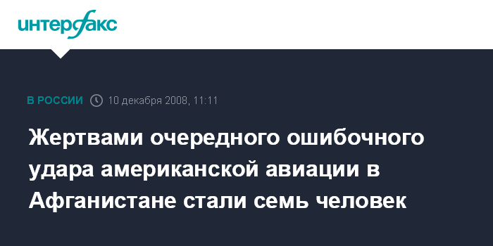 По данным представителей вооруженных сил США, удар был нанесен "по ошибке" в тот момент, когда американская авиация выслеживала талибов в районе афганского города Калат (провинция Забуль). "Мы глубоко сожалеем в связи с этим происшествием, в результате которого погибли семь и ранения получили 13 человек. Начато расследование", - отмечается в коммюнике, распространенном армией США.
