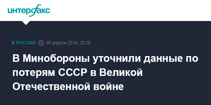 Москва. 30 апреля. INTERFAX.RU - В Минобороны РФ заявляют, что в ходе Великой Отечественной Войны СССР потерял более 8,8 млн военнослужащих.