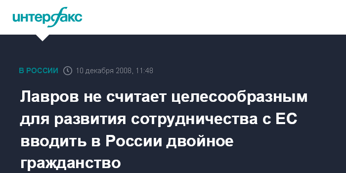 Москва. 10 декабря. INTERFAX.RU - Министр иностранных дел Сергей Лавров считает, что в России не нужно вводить двойное гражданство, а развитию отношений с Евросоюзом способствовало бы установление безвизового режима.
