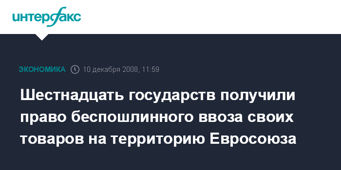 Шестнадцать государств получили право беспошлинного ввоза своих товаров на территорию Евросоюза