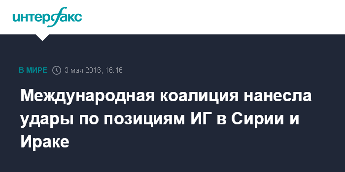 Москва. 3 мая. INTERFAX.RU - Руководимая США международная коалиция против "Исламского государства" (ИГ, запрещенная в России группировка) нанесла накануне 29 авиаударов по позициям исламистов в Сирии и Ираке, сообщило командование коалиции во вторник.