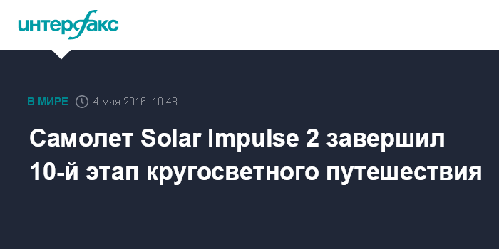 Самолет Solar Impulse 2 завершил 10-й этап кругосветного путешествия