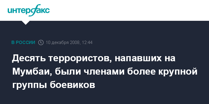 Индийская полиция продолжает настаивать на том, что в нападении на Мумбаи участвовали только 10 человек, отмечает издание. По словам представителя полиции Мумбаи, информация об общем количестве террористов была получена от единственного оставшегося в живых участника нападения на город, захваченного правоохранительными органами Индии.