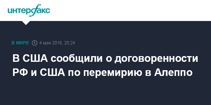 Москва. 4 мая. INTERFAX.RU - Представители США и РФ достигли согласия по вопросу о распространения перемирия между сторонами конфликта в Сирии на Алеппо, сообщает в среду агентство Associated Press со ссылкой на неназванные американские официальные лица.