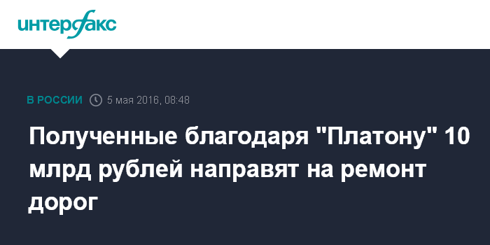 Москва. 5 мая. INTERFAX.RU - Премьер-министр РФ Дмитрий Медведев поручил перевести 10 млрд рублей, полученные из доходов от системы "Платон" по оплате проезда большегрузов, на восстановление дорог, сообщается в среду на сайте правительства РФ.