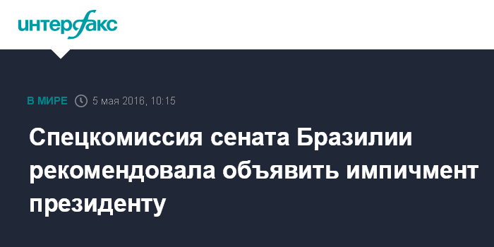 Москва. 5 мая. INTERFAX.RU - Специальная комиссия Федерального сената Бразилии рекомендовала начать процедуру импичмента президента страны Дилмы Русеф, сообщают местные СМИ.