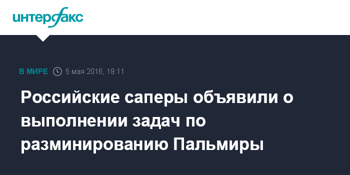 Москва. 5 мая. INTERFAX.RU - Задача, поставленная президентом России Владимиром Путиным по разминированию Пальмиры, полностью выполнена, сообщил в четверг журналистам начальник инженерных войск ВС РФ Юрий Ставицкий.