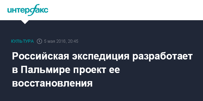 Москва. 5 мая. INTERFAX.RU - Министр культуры РФ Владимир Мединский сообщил журналистам, что в Пальмиру будет направлена специальная экспедиция для подготовки проекта поэтапного восстановления исторической части города.