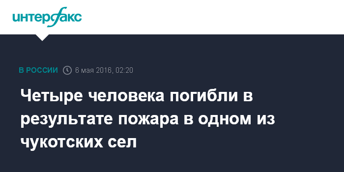 Москва. 6 мая. INTERFAX.RU - Оперативные службы села Янракыннот на Чукотке выясняют причины пожара, в котором предварительно погибли четыре человека.