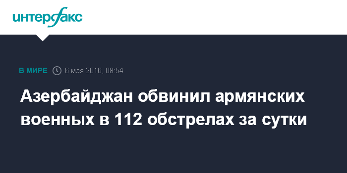 Москва. 6 мая. INTERFAX.RU - Армянские военные за минувшие сутки 112 раз нарушили режим прекращения огня на линии соприкосновения с использованием 60-миллиметровых минометов, гранатометов и крупнокалиберных пулеметов, сообщает пресс-служба Министерства обороны Азербайджана.