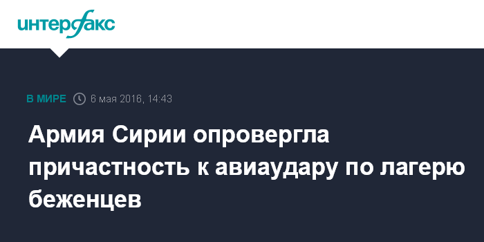 Москва. 6 мая. INTERFAX.RU - Власти Сирии в пятницу опровергли информацию об их ответственности за авиаудар по лагерю беженцев близ города Идлиба, в результате которого погибли не менее 30 беженцев.