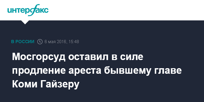 Москва. 6 мая. INTERFAX.RU - Мосгорсуд признал законным продление ареста бывшему главе Коми Вячеславу Гайзеру, его бывшему заместителю Алексею Чернову и трем другим фигурантам дела об организации преступного сообщества в регионе.