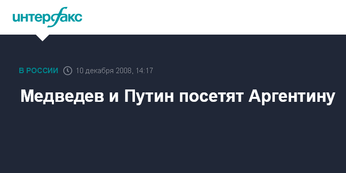 Москва. 10 декабря. INTERFAX.RU - Президент Аргентины Кристина Фернандес де Киршнер пригласила президента РФ Дмитрия Медведева и председателя правительства РФ Владимира Путина посетить ее страну с официальными визитами.