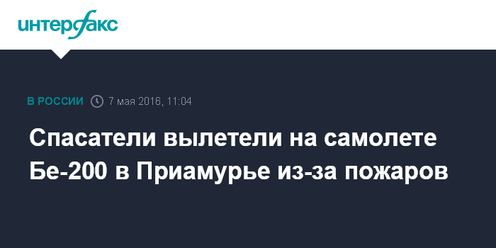 Москва. 7 мая. INTERFAX.RU - Самолет "Бе-200 ЧС" Хабаровского авиационно-спасательного центра МЧС России вылетел из Хабаровска в Амурскую область, где из-за сухой погоды и сильного ветра осложнилась пожароопасная обстановка.
