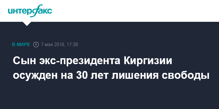 Москва. 7 мая. INTERFAX.RU - Младший сын бывшего президента Киргизии Курманбека Бакиева Максим признан виновным по трем статьям Уголовного кодекса и приговорен к 30 года лишения свободы и выплате штрафа, сообщили в субботу "Интерфаксу" в пресс-службе Верховного суда (ВС).