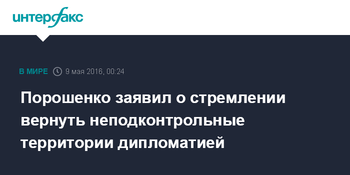 Москва. 9 мая. INTERFAX.RU - Президент Украины Петр Порошенко заявил, что Украина делает ставку на политико-дипломатический путь возвращения неподконтрольных Киеву территорий под украинский суверенитет.