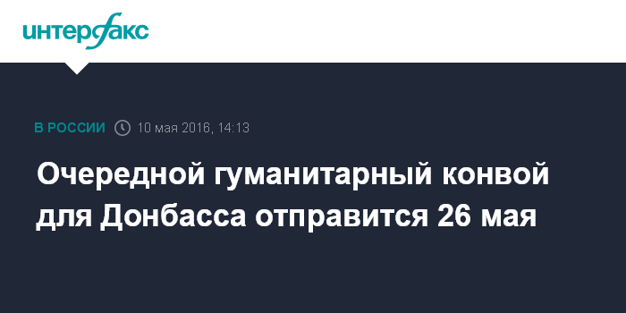 Москва. 10 мая. INTERFAX.RU - Следующий гуманитарный конвой будет отправлен в Донбасс 26 мая, сообщил журналистам во вторник заместитель главы МЧС Владимир Артамонов.