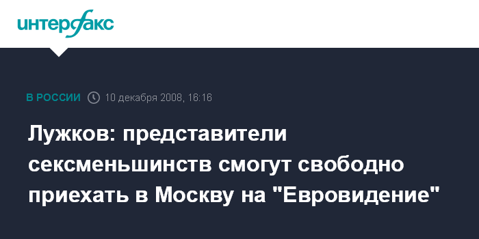 Москва. 10 декабря. INTERFAX.RU - Представители сексуальных меньшинств, как и любые другие граждане, могут свободно приезжать в Москву на конкурс "Евровидение-2009", заявил мэр Юрий Лужков в среду на пресс-конференции после торжественной церемонии передачи Москве символических ключей от "Евровидения".