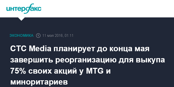 СТС Media планирует до конца мая завершить реорганизацию для выкупа 75% своих акций у MTG и миноритариев