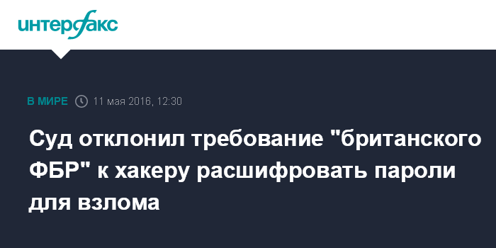 Москва. 11 мая. INTERFAX.RU - В Великобритании суд отклонил требование Национального агентства по борьбе с преступностью, предъявленное к предполагаемому хакеру, расшифровать его собственные пароли, примененные при взломе компьютерных систем важнейших структур США, пишет The International Business Times.