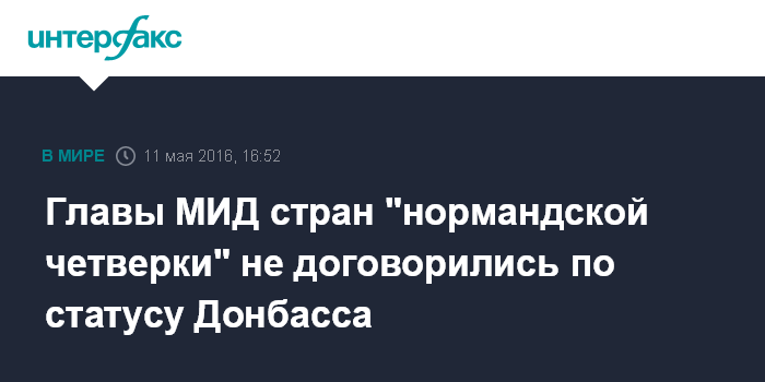 Москва. 11 мая. INTERFAX.RU - Участники переговоров в "нормандском формате" не смоли достичь на встрече в Берлине прогресса в решении вопроса выборов в Донбассе и предоставления ему особого статуса, заявил глава МИД РФ Сергей Лавров.