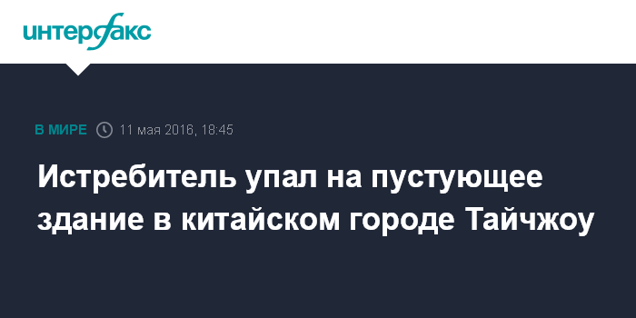 Москва. 11 мая. INTERFAX.RU - Истребитель рухнул в среду на многоэтажное здание в китайском городе Тайчжоу (провинция Чжэцзян), сообщает Центральное телевидение Китая.