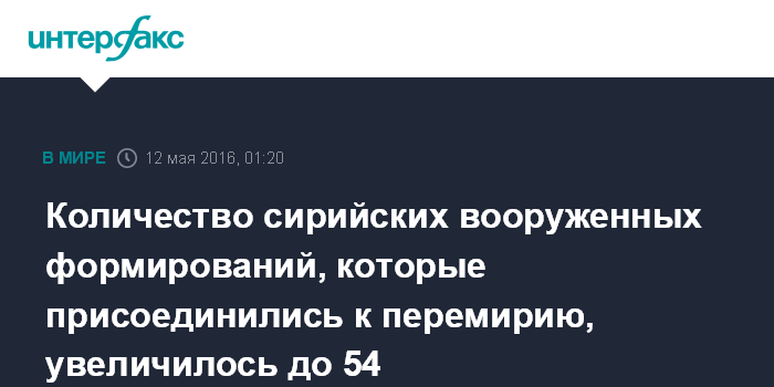Москва. 12 мая. INTERFAX.RU - До 54 увеличилось число сирийских вооруженных формирований, которые присоединились к перемирию, сообщил в среду сайт Минобороны РФ.
