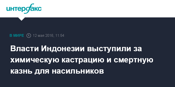 Москва. 12 мая. INTERFAX.RU - Власти Индонезии выступили за химическую кастрацию и смертную казнь в отношении насильников, сообщает ABC News.