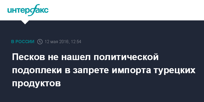 Москва. 12 мая. INTERFAX.RU - В Кремле заявили, что в запрете импорта в Россию ряда турецких продуктов не следует искать политической подоплеки. Пресс-секретарь президента РФ Дмитрий Песков заявил журналистам в четверг, что Россельхознадзор не занимается политикой, а работает в своем специфическом направлении.