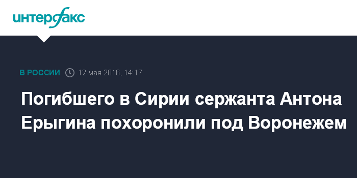 Москва. 12 мая. INTERFAX.RU - В Рамонском районе Воронежской области в четверг прошли похороны сержанта Антона Ерыгина, погибшего при обстреле в сирийской провинции Хомс, передает корреспондент "Интерфакса".