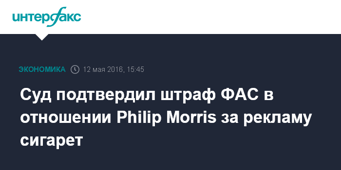 Москва. 12 мая. INTERFAX.RU - Арбитражный суд Московского округа в четверг подтвердил решение судов нижестоящих инстанций, признавших законным постановление УФАС России по Московской области о нарушении российской структурой табачного концерна Philip Morris International (PMI) - ООО "Филип Моррис Сэйлз энд Маркетинг" - закона при рекламе сигарет.