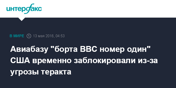 Москва. 13 мая. INTERFAX.RU - Объединенная база морской авиации США Эндрюс, где постоянно находится президентский "борт ВВС номер один", была временно блокирована силами безопасности в связи с угрозой взрыва, сообщили СМИ со ссылками на заявление представителя базы.