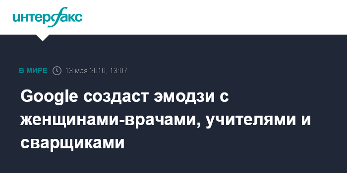 Москва. 13 мая. INTERFAX.RU - Google создаст 13 эмодзи с женщинами-представительницами разных профессий, в том числе врача, ученого, программиста и сварщика, чтобы побороть гендерное неравенство, пишет Mashable.