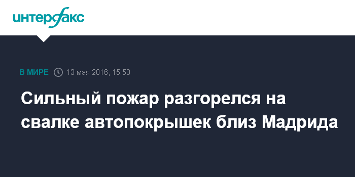 Москва. 13 мая. INTERFAX.RU - Сильный пожар разгорелся в пятницу на крупнейшей в Испании свалке автомобильных шин недалеко от Мадрида, сообщает сайт испанской газеты El Pais.