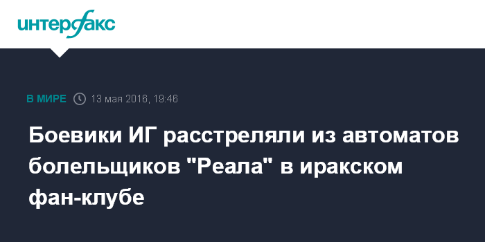 Москва. 13 мая. INTERFAX.RU - Боевики террористической организации "Исламское государство", запрещенной в России, напали на фан-клуб мадридского футбольного клуба "Реал" в иракском городе Балад, сообщает британская газета The Daily Mail.