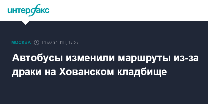 Москва. 14 мая. INTERFAX.RU - Автобусы 600-го и 802 маршрутов следуют измененной трассой из-за массовой драки на Хованском кладбище.
