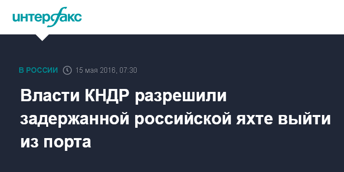Москва. 15 мая. INTERFAX.RU - Власти Северной Кореи проинформировали российских дипломатов, что задержанной российской яхте "Элфин" разрешено покинуть северокорейский порт Кимчак, сообщил в воскресенье пресс-секретарь посольства РФ в Пхеньяне Денис Самсонов в эфире телеканала "Россия-24".
