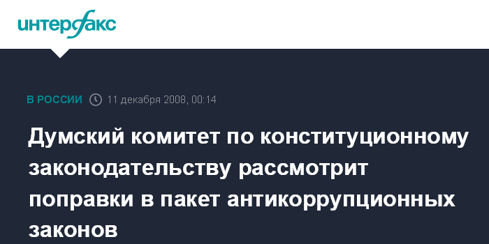 Москва. 11 декабря. ИНТЕРФАКС - Комитет Госдумы по конституционному законодательству и государственному строительству в четверг рассмотрит поправки депутатов к пакету антикоррупционных законопроектов, инициированных президентом РФ.
