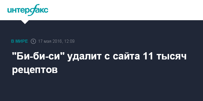 Москва. 17 мая. INTERFAX.RU - "Би-би-си" уберет со своего сайта более 11 тысяч рецептов в рамках выполнения плана по экономии, который поможет вещателю снизить расходы на 15 млн фунтов стерлингов в год. О соответствующем решении будет объявлено позже во вторник, пишет The Guardian.