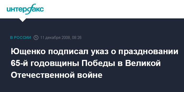Москва. 11 декабря. INTERFAX.RU - Президент Украины Виктор Ющенко подписал указ о подготовке и праздновании в 2010 году 65-й годовщины Победы в Великой Отечественной войне 1941 - 1945 лет. Об этом сообщает пресс-служба главы украинского государства.