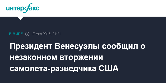 Москва. 17 мая. INTERFAX.RU - Президент Венесуэлы Николас Мадуро во вторник заявил, что американский самолет-разведчик нарушил воздушное пространство страны.